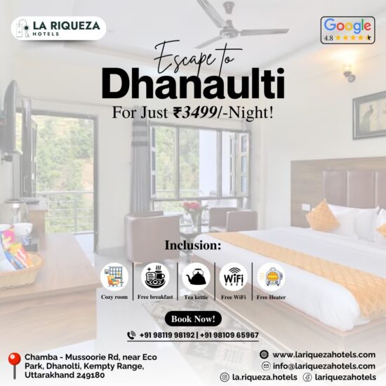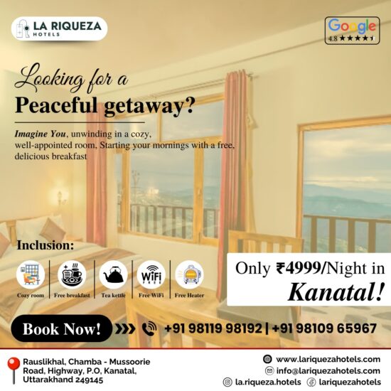 Escape to the tranquil beauty of Kanatal at LA Riqueza Hotel Raunsali, a 4-star retreat offering breathtaking views of the Gangotri Mountains and the majestic Himalayas. Located just 39 km from Gun Hill Point, Mussoorie, and Landour Clock Tower, our hotel is the perfect getaway for those seeking peace, adventure, and luxury amidst nature.